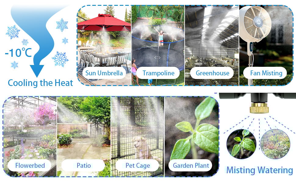 - Misting Watering & Outdoor Water Playing: Watering by misting can cover a more large area than traditional watering, increasing humidity effectively and reducing dust particles, giving a uniform water volume for plant watering in garden, vegetable land,landscaping,greenhouse, giving a continuous misting water for cleaning in livestock farm.