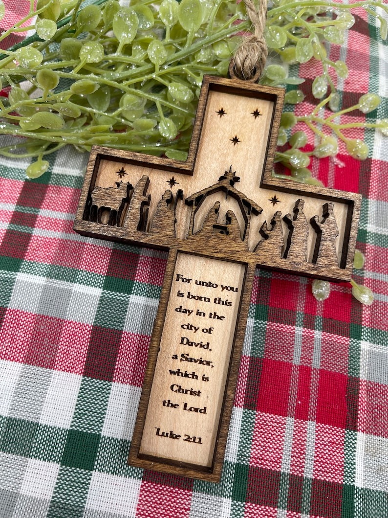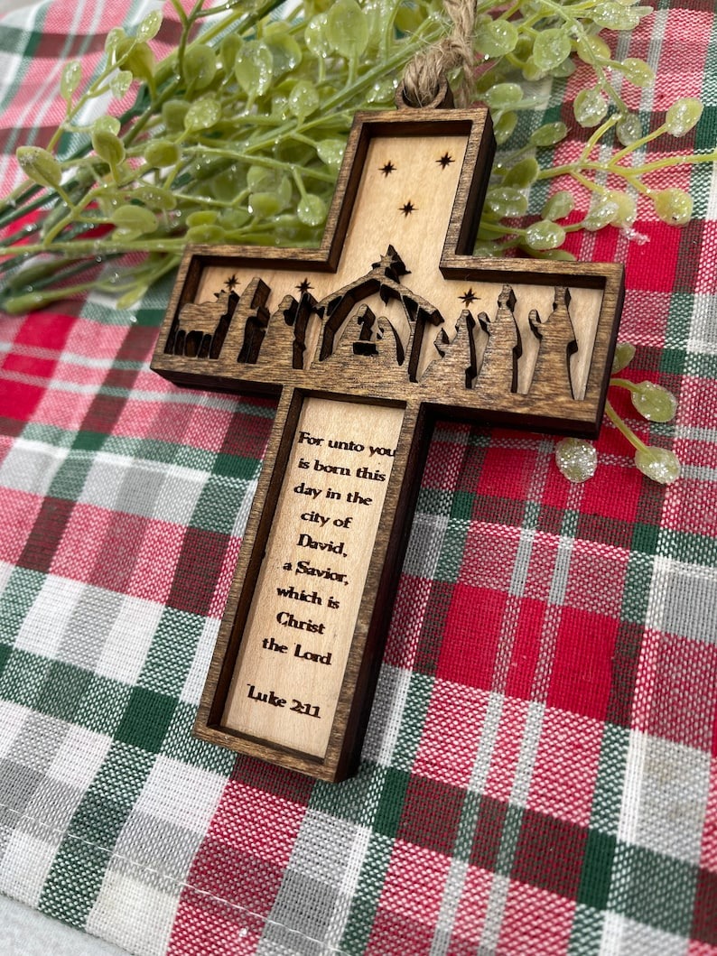 The top layer is stained and depicts the manger scene while the bottom layer is finished and engraved with stars and the scripture from Luke 2:11 For unto you is born this day in the city of David, a Savior, which is Christ the Lord.