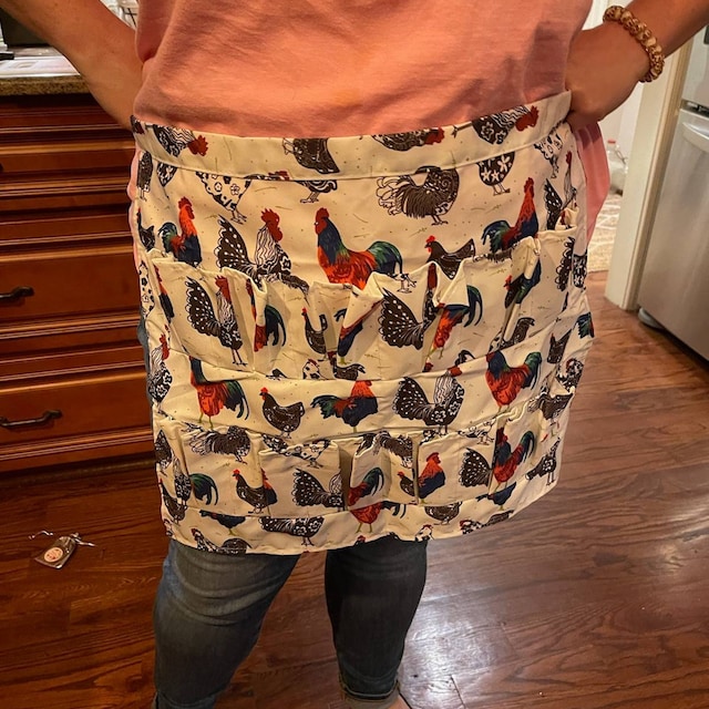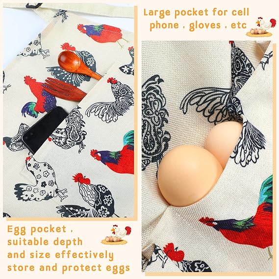 The beautiful and convenient alternative to the basket apron with 12 Specially stitched pockets, and the 50cm * 35cm(L*W )perfect pocket-size can hold the eggs securely. Hands-free and no more needing a chicken egg basket that breaks chicken and duck eggs in your coop.