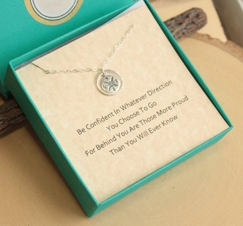 This listing includes the sterling silver compass necklace presented on a Sentiment card with the below wording: