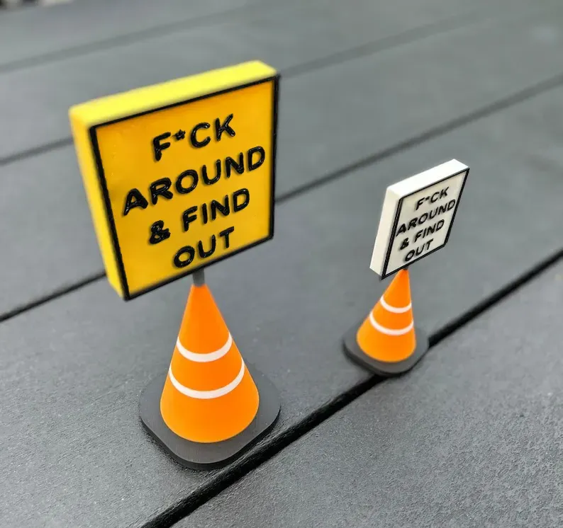 🤣The F**k Around/Find Out Mini Hazard Cone Desk Decoration is suitable for various settings. Simply place it on your desk, bookshelf, or any other flat surface. It can be used as a standalone decoration or combined with other desk accessories to create a personalized workspace. Perfect for your man cave or just a reminder for all guests ;)