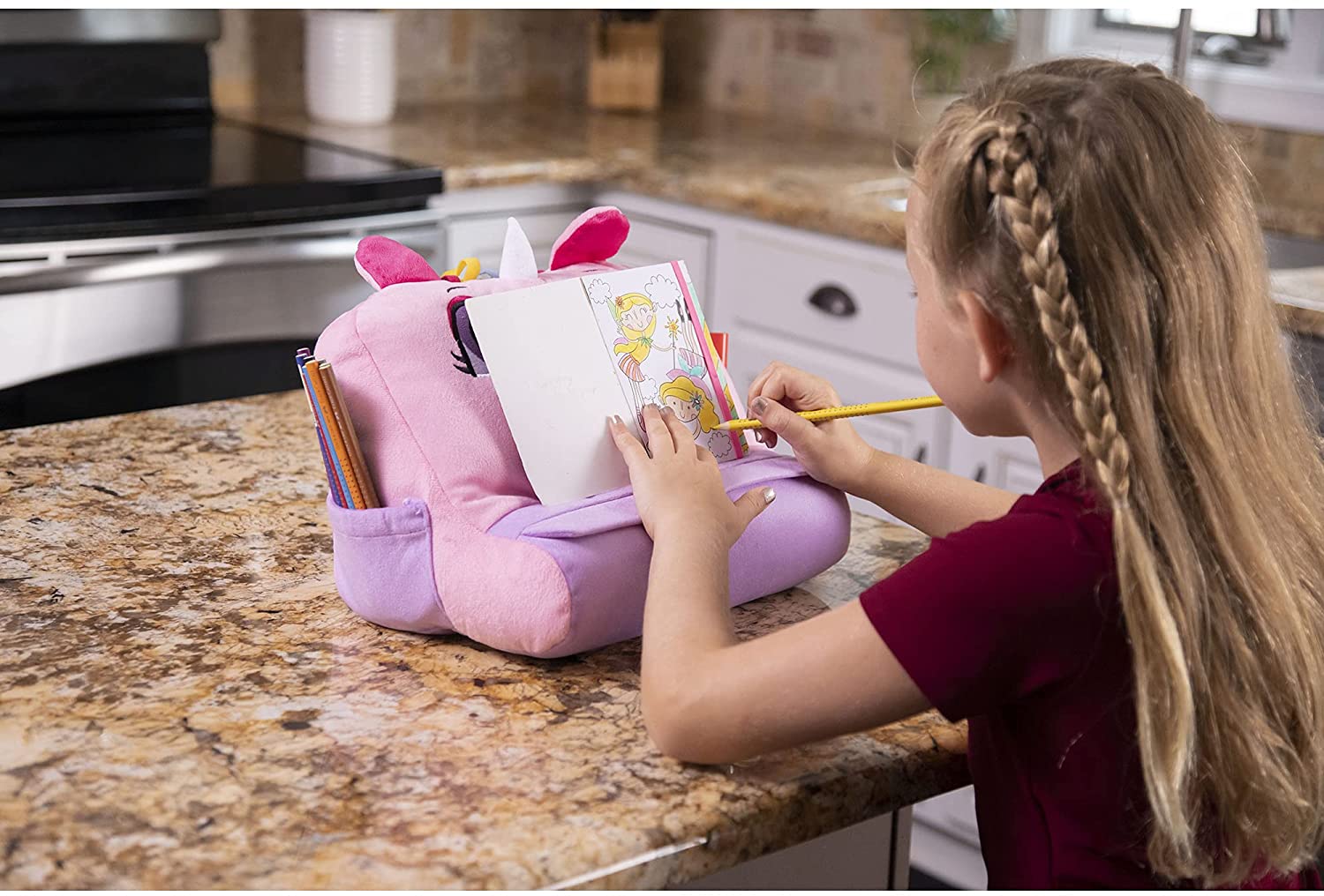 Designed like a cuddly unicorn, the holder has a large back pocket and 2 side pockets. It’s the best bookshelf to make learning fun! The sturdy built-in shelf holds any device at the perfect height, to keep kids sitting upright!