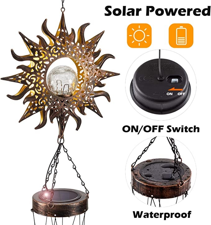 【Unique Design】The retro sun wind chimes solar garden light adding charming lighting effects. The cracked glass ball is like a beautiful crystal ball, providing warm light and a romantic atmosphere for your yard. Not only a wind chime for outside but also a solar garden light decor.