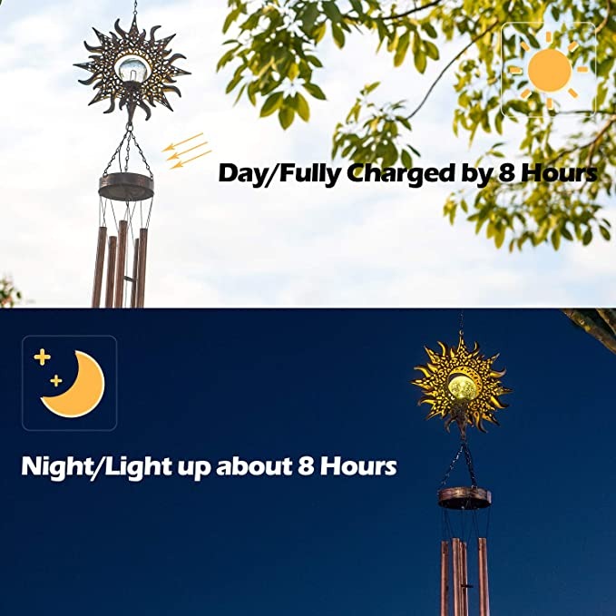 【2 IN 1; COPPER CHIMES + THE SOLAR LIGHT】 - Perfect combination of sight and hearing. This solar wind chimes add 5 copper tubes, which make a pleasant sound when the breeze blows. At night, they will shine in wonderful a bright golden color. Makes a gorgeous, warm toned, serene sound. The solar light turns on when it gets dark and turns off when it gets light.