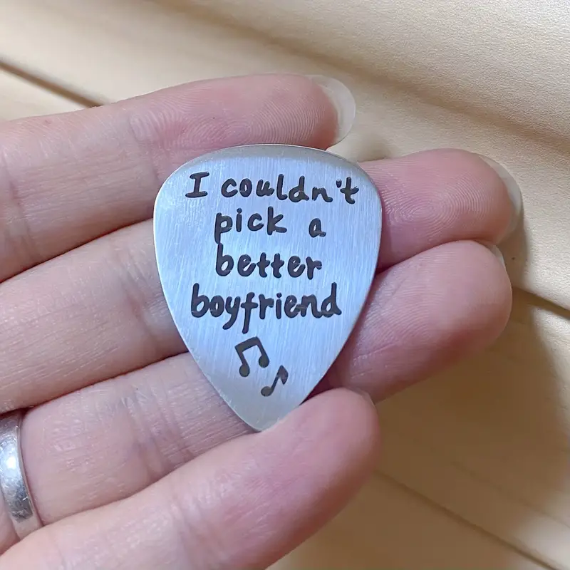 🎸With phrases like "I Couldn't Pick A Better Boyfriend" and "I'd Pick You Every Time," he'll be reminded of your affection every time he plays his guitar.